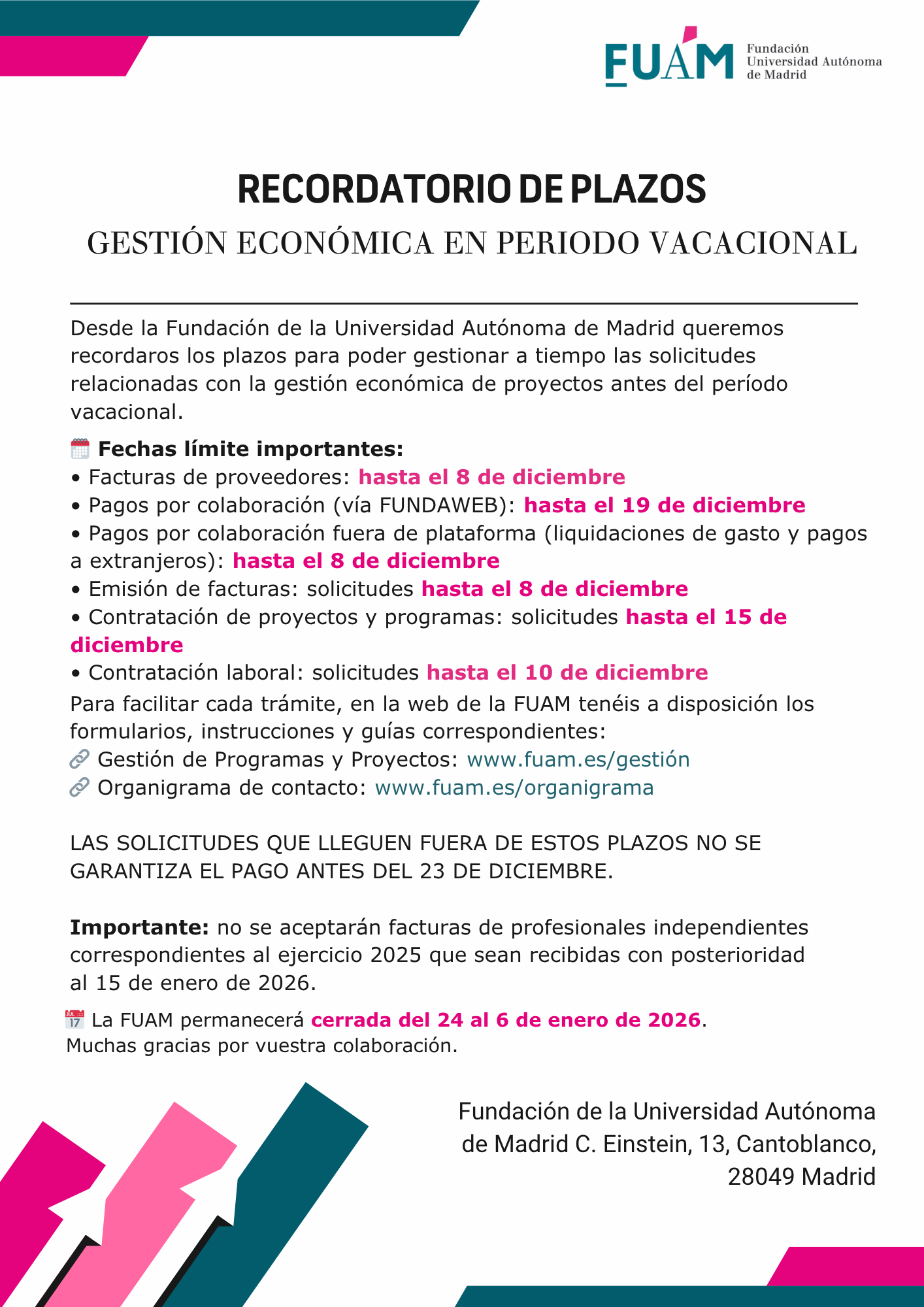 Recordatorio de plazos de gestión económica en periodo vacacional de la FUAM.
