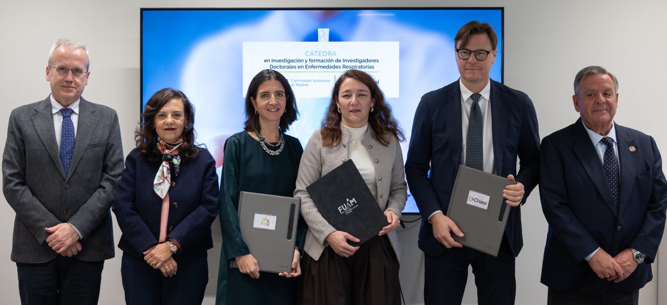 La Universidad Autónoma de Madrid (UAM), la Sociedad Madrileña de Neumología y Cirugía Torácica (NeumoMadrid), y Chiesi España, a través de la Fundación de la Universidad Autónoma de Madrid (FUAM), han firmado la renovación por 3 años del convenio que da continuidad a la Cátedra UAM–NEUMOMADRID–CHIESI en Enfermedades Respiratorias, una iniciativa que cumple cinco años impulsando la investigación, la docencia y la formación de investigadores doctorales en el ámbito de las enfermedades respiratorias.